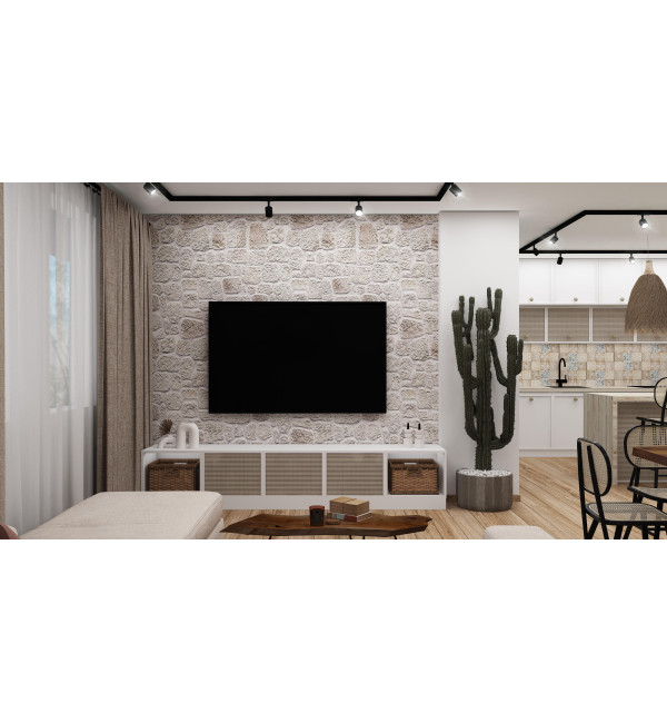 a sunny and warm atmosphere. The furniture has simple shapes and high